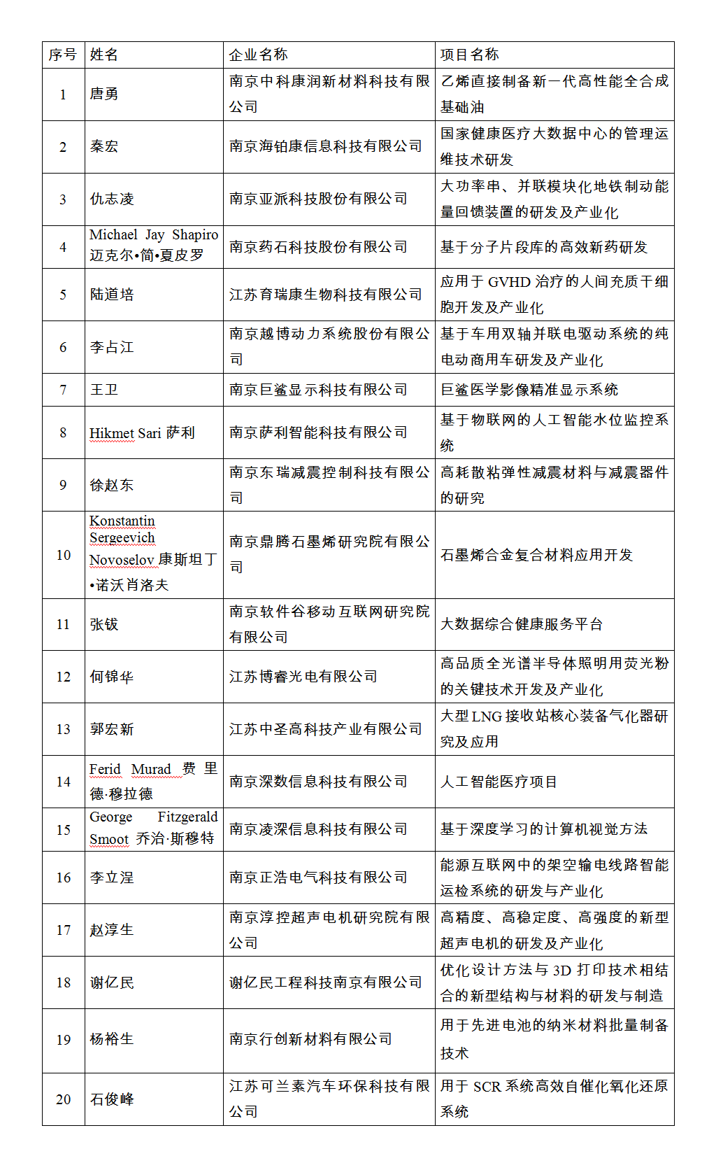 2017年度南京市“科技顶尖专家集聚计划”拟入选名单(20人)